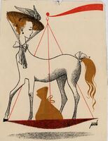 CAZA DE DOTES. Sobre el platillo de una balanza azul se encuentran un caballo castaño con cara de mujer con el pelo suelto y un sombrero, y un saco blanco de dinero. El dibujo se halla ligeramente enmarcado.Boceto realizado para la ilustración de la revista semanal Novelas y Cuentos. Titulo: Caza de Dotes. Autor: Víctor Margueritte. Nº publicado: 1229. Fecha: 28-11-54. Tomo NC.: 34.