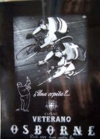Ciclistas Cartel compuesto sobre un fondo negro con la fotografía de dos ciclista en carrera, debajo la silueta en blanco de un hombre de perfil ofreciéndoles una copita, seguido de los rótulos y leyendas correspondientes a la publicidad del coñac Veterano Osborne.