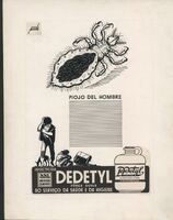 Dedetyl. Piojo del hombre Bajo el lema de “dedetyl” en la parte inferior se quiere anunciar un producto contra los insectos como el que se puede observar en el centro del cartel publicitario en color negro, un piojo de hombre. Destacan las líneas oscuras sobre un fondo claro. Se puede apreciar, también, la firma del autor en la parte superior de la derecha.