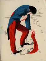 DEMETRIO RUDIN. Un hombre cuya acción es difícil de definir se encuentra en posición de perfil y ligeramente agachado intentando coger algo del suelo de color rojo. Su traje se compone de pantalón a rayas blancas y rojas, túnica azul y fajín rojo. Mediante líneas a lápiz se ha enmarcado el dibujo.Boceto realizado para la ilustración de la revista semanal Novelas y cuentos. Titulo: Demetrio Rudin. Autor: Ivan Turqueniev. Nº publicado: 1189. Fecha: 21-02-1954. Tomo NC. 34.