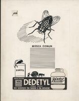 Dedetyl. Mosca Común En este cartel publicitario se anuncia, en la parte inferior, un producto llamado “dedetyl” que lucha contra los insectos como el que se puede apreciar en el centro en color negro, la mosca común. Destacan las líneas negras sobre un fondo claro como también la firma del pintor en la parte superior de la derecha.