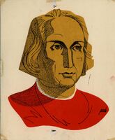 Cristóbal Colón En este retrato firmado se representa el busto de un personaje masculino, muy probablemente Cristóbal Colón, de frente, con el tono de piel amarillento y en el que destaca una camiseta de color rojo. El pelo relativamente largo lo lleva suelto.Prueba de imprenta. Ilustración realizada para la revista semanal Novelas y Cuentos. Titulo: Autor: Nº publicado: Fecha: Tomo NC.
