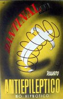 Dantinal Lefa Cartel de un nuevo medicamento contra el mareo de los laboratorios Lefa, con la imagen de un muñeco de papel en blanco rodeado por una espiral negra que simula la sensación que produce estar mareado.