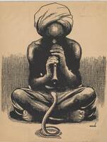 El encantador de serpientes En este dibujo firmado en donde destacan las líneas en tonos grises y negros se ve la imagen de un hombre sentado con las piernas cruzadas y con un turbante sobre su cabeza tocando una flauta mientras encanta a una serpiente.Prueba de imprenta. Ilustración realizada para la revista semanal Novelas y Cuentos. Titulo: Autor: Nº publicado: Fecha: Tomo NC.: