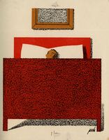 EL ENFERMO La escena parece ocurrir en un dormitorio que se compone de una cama con los respaldos de color rojo en la que se ve apenas una figura con cabellera amarilla apoyada en un gran almohadón blanco. Sobre la cama un cuadro con marco amarillo y de fondo grisáceo. Otra vez el dibujo es enmarcado.Boceto realizado para la ilustración de la revista Novelas y Cuentos. Titulo: El Enfermo. Autor: Azorín. Nº public.: 1264. Fecha: 31-07-1955. Tomo NC.: 44. PI/. 263