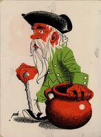 El enano con una olla En esta composición firmada se encuentra en el centro la imagen de una figura peculiar. Se trata de un enano con el traje verde y zapatos negros. Sobre su cabeza lleva un gran sombrero negro y en su rostro destacan espesas barbas blancas. En su mano derecha sostiene un baston y la mano izquierda se apoya sobre una olla de color bronce y de un tamaño pequeño.Prueba de imprenta. Ilustración realizada para la revista semanal Novelas Y Cuentos. Titulo: Autor: Nº publicado: Fecha: Tomo NC.: