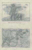 El encierro Boceto a lápiz de las caras de la medalla titulada El encierro, en el anverso la escena de unos mozos corriendo ante el toro en un encierro junto al reverso donde se aprecia en primer término la cabeza de un hombre inclinada bebiendo de una bota de vino.Para la casa de la moneda, Serie A Tauromaquia. Otros archivos: MBR/1392 MEP/ 1680