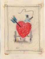 El DUELO. Sobre un carro azul, visto por su parte trasera, conducido por un hombre con un látigo se encuentra un gran corazón rojo atravesado por una flecha azul. El dibujo está firmado por el artista.Prueba de imprenta. Ilustracion realizada para la revista semanal Novelas y Cuentos. Titulo: El duelo. Autor: Carlo9s Dickenx. Nº publicado: 1157. Fecha: 12-07-1953. Tomo NC.: 51