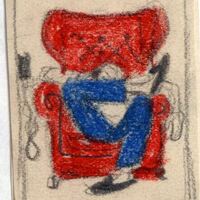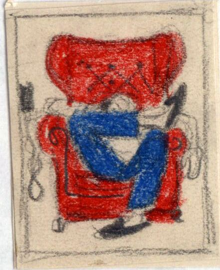 Sobre un sillón de tamaño grande se encuentra un hombre del que apenas se ve su cabeza. El hombre sentado cruza las piernas y deja caer sus manos. Su pantalón es azul, sus zapatos negros y la camisa es blanca. A su lado derecho colgado en la pared un teléfono. El dibujo se halla en un encuadre formado por líneas abocetadas.Boceto realizado para la ilustración de la revista semanal Novelas y Cuentos. Titulo: Los amores de Alonso y Rosana. Autor: Mark Twain. Nº publicado: 1242. Fecha: 27-02-1955. Tomo NC.: 60. PI/437