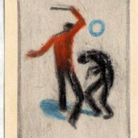 Dos hombres se sitúan en el centro de la escena de este dibujo enmarcado. Uno de los hombres con traje rojo y negro y con un palo en la mano se dispone a pegar al segundo hombre con traje oscuro que se encuentra ligeramente agachado ante el temor de la agresión. Las sombras que se desprenden de las figuras son de color azul y sobre el hombre de negro se encuentra una figura geométrica redondeada de contorno azul.Boceto realizado para la ilustración de la revista semanal Novelas y Cuentos. Titulo: Autor: Nº publicado: Fecha: Tomo NC.:PI/ No