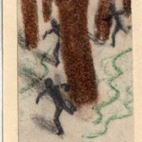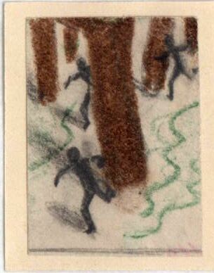 Líneas verdes y ondulantes dan la sensación de crear movimientos de agua o de caminos. Unas sombras corren apresuradamente. Anclados al suelo hay largos y gruesos palotes marrones que representan los árboles. El dibujo está enmarcado.Boceto realizado para la ilustración de la revista semanal Novelas y cuentos. Titulo: Tom Sawyer detective. Autor: Mark Twuin. Nº publicado: 1011. Fecha: 24-09-1950. Tomo NC. 28. PI/. 450