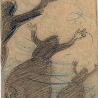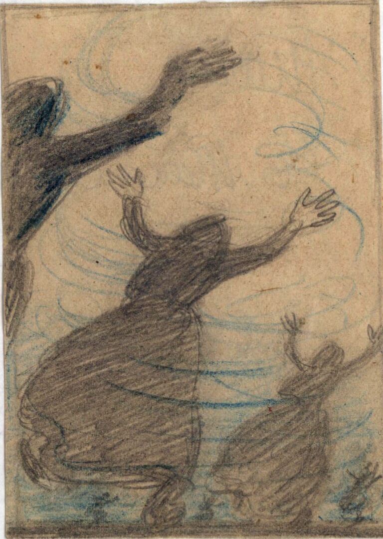 Tres figuras parece que huyen levantando sus brazos y sus pies. Sus formas son grisáceas. Una atmósfera azulada envuelve a las figuras y les otorga un cierto dramatismo difícil de explicar.Boceto realizado para la ilustración de la revista semanal Novelas y Cuentos. Titulo: Marea de la mañana. Autor: Neil N. Gunn. Nº publicado: 779. Fecha: 14-04-1946. Tomo NC. 7. PI/. 404