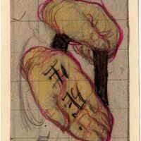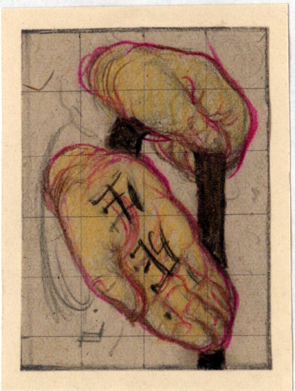 Sobre fondo cuadriculado y oscuro este dibujo enmarcado representa dos grandes manos amarillas con su silueta de color rosa e inscripciones orientales. La mano izquierda parece agarrar la empuñadura de un baston la derecha en forma pedigüeña. El bastón dibujado en negro. Abocetada la firma del dibujante parte inferior izquierda.Boceto realizado para la ilustración de la revista semanal Novelas y Cuentos. Titulo: La puerta de las cinco felicidades. Autor: Walter neck. Nº publicado: 923. Fecha: 16-01-1949. Tomo NC. 10. PI/ 59