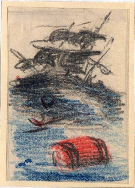 En un fondo azul simbolizando el agua del mar flota un barril de color rojo. A lo lejos se vislumbran los mástiles y velas negras de una carabela, lo que nos simula la idea de un naufragio. El dibujo está enmarcado.Boceto realizado para la ilustración de la revista semanal Novelas y cuentos. Titulo: Las inquietudes de Santi Andía. Autor: Pío Baroja. Nº publicado: 798. Fecha: 25-08-1946. Tomo NC.: 17. PI/. 361
