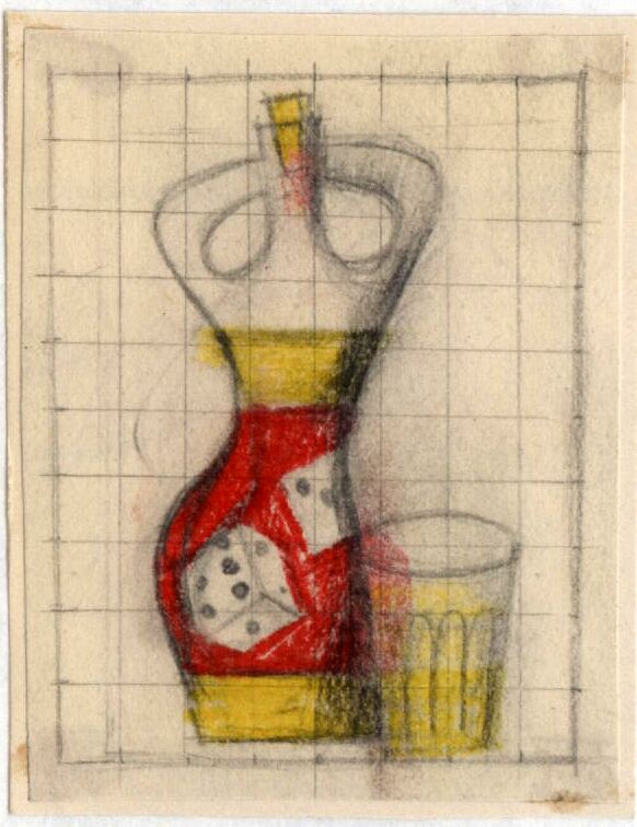 Sobre fondo cuadriculado y enmarcado se han dibujado una botella en forma de mujer como insinuandose y un vaso. A la botella le adornan tres franjas de colores: amarilla, roja en la que hay dibujados unos dados blancos y amarilla, de nuevo. El vaso adquiere unos tonos amarillentos.Boceto realizado para la ilustración de la revista semanal Novelas y cuentos. Titulo: Mujeres … . Autor: Paul Kock. Nº publicado: 1168. Fecha: 27-09-1953. Tomo NC.: 42. PI/. 98