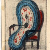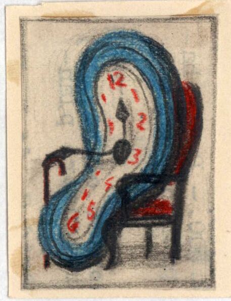 Fruto de la fantasía el pintor ha realizado una escena enmarcándola en la que un reloj azul se sienta sobre una silla de color roja. Sus manecillas son negras y en forma de flecha. Sus números son de color rojo sobre un fondo blanco.Boceto realizado para la ilustración de la revista semanal Novelas y Cuentos. Titulo: El reloj del Sr. Humphrey. Autor: Carlos Dickens. Nº Publicado: 1077. Fecha: 30-12-1951. Tomo NC.: 53. PI/. 523