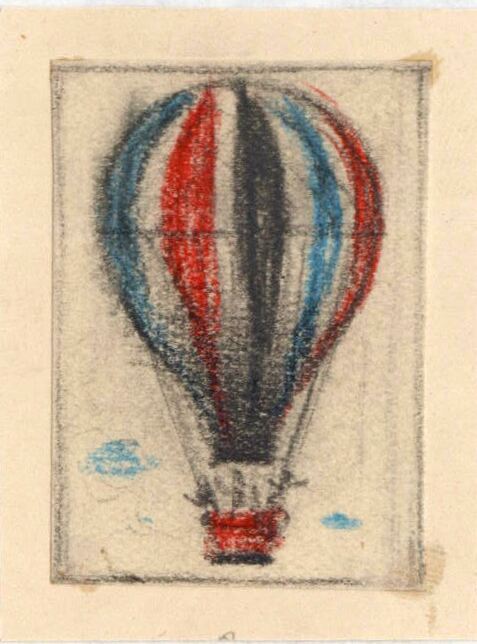 - En el dibujo enmarcado destaca la imagen de un globo de color azul, negro, rojo y blanco. Colores distribuidos en rayas. De su cesto se aprecian figuras humanas que intentan saltar.Boceto realizado para la ilustración de la revista semanal Novelas y Cuentos. Titulo: Autor: Nº publicado: Fecha: Tomo NC.: PI/. No
