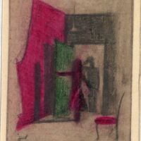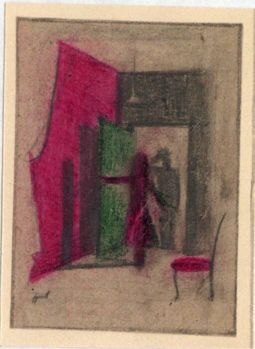 Desde el interior de una habitación en penumbra una mujer abre una puerta verde para dar paso a la visita que espera, un hombre que coge su sombrero saludando. En la habitación hay una silla rosa al igual que la pared, por detrás de la puerta abierta. El pintor ha firmado el dibujo que se encuentra enmarcado.Boceto realizado para la ilustración de la revista semanal Novelas y Cue ntos. Titulo: Autor: Nº publicado: Fecha: Tomo NC.: PI/ No