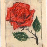 - Sobre fondo claro el artista ha dibujado, enmarcándola, una gran rosa que ocupa todo el espacio. Sus pétalos son de un rojo intensísimo, su tallo con espinas es castaño y a cada lado del tallo crece una hoja.Boceto realizado para la ilustración de la revista Novelas y Cuentos. Titulo: Autor: Nº publicado: Fecha: Tomo NC.: PI/. No