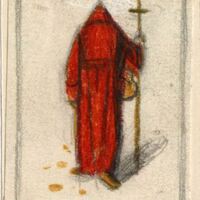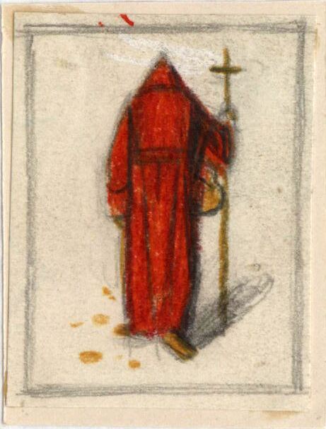 La figura estilizada de un monje de largos hábitos rojos y encapuchado, de espalda y con un cayado, en forma de cruz, en la mano es el protagonista de este dibujo enmarcado.Boceto realizado para la ilustración de la revista semanal Novelas y Cuentos. Titulo: El amor de los amores. Autor: Ricardo León. Nº publicado: 1295. Fecha: 04-03-1956. Tomo NC.: 30. PI/. 221