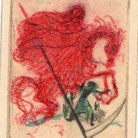 - Simbolizando la muerte un caballero rojo sobre su esquelético caballo envuelve con su guadaña unas diminutas figuras humanas con trajes verdes que corren aterrorizadas ante tal visión. La imagen se halla enmarcada.Boceto realizado para la ilustración de la revista semanal Novelas y Cuentos. Titulo; Autor: Nº publicado: Fecha: Tomo NC.: