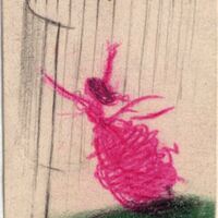 Sobre un monte de un verde intenso una muchacha con un traje color de rosa corre lanzando sus brazos ante una pared formada por barrotes, pareciendo tratarse de una jaula.Boceto realizado parfa la ilusgtracion de la revista semanal Novelas y Cuentos. Titulo: La Esposa de Sir Isaac Harman. Autor: H. G. Wells. Nº publicado: 894. Fecha: 04-05-1947. Tomo NC. 19.