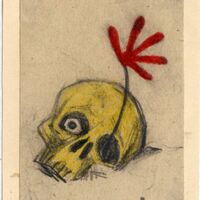 - Sobre el suelo yace una calavera amarilla, de se asoma, en su lado derecho, un impresionante ojo. De su ojo izquierdo crece una flor de enorme tallo y pétalos rojos. La imagen del dibujo está enmarcada.Boceto realizado para la ilustración de la revista semanal Novelas y Cuentos. Titulo: Autor: Nº publicado: Fecha: Tomo Nc.:
