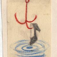 Un anzuelo grande y rojo que surge de la parte superior del dibujo rescata de las aguas, formadas por círculos azules, un zapato de mujer de color negro. La escena del dibujo se halla enmarcada.Boceto realizado para la ilustración de la revista semanal Novelas y Cuentos. Titulo: La mujer en el umbral. Autor: Warmick Deeping . N º publicado: 1317. Fecha: 05-08-1956. Tomo NC.: 28.