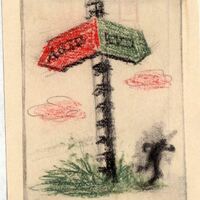 Clavado en un suelo de hierbas un poste de señalización señala dos caminos hacia la derecha con una flecha roja y hacia la izquierda con una flecha verde. En cada flecha hay una palabra inscrita de difícil percepción. Por el camino de la izquierda un hombre emprende su carrera. El dibujo se encuentra enmarcado.Boceto realizado para la ilusgtracion de la revista semanal Novelas y Cuentos. Titulo: La Fiera en acecho. Autor: Valentine Willians. Nº publicado: 946. Fecha: 26-06-1949. Tomo NC.: 3
