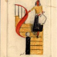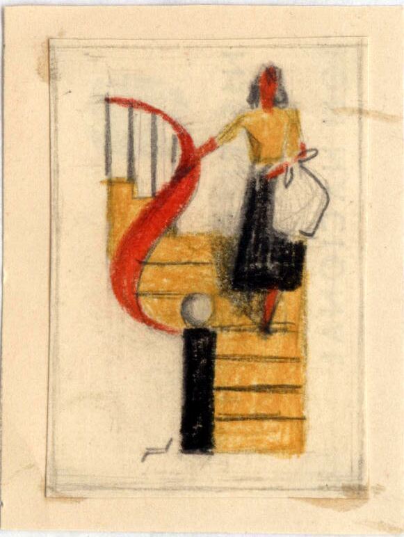 Aparece bajando la escalera de peldaños amarillos y barra de apoyo roja una mujer alta, de pelo oscuro, falda negra, camisa de manga corta amarilla llevando un bolso blanco. Se puede apreciar el posible boceto de la firma del pintor. El dibujo está ligeramente enmarcado.Boceto realizado para la ilustración de la revista semanal Novelas y Cuentos. Titulo: Nunca es Tarde. Autor: Estrella Gibbons. Nº publicado: 1128. Fecha: 21-12-1952. Tomo NC.: 57.