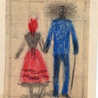 La figura de dos enamorados cogidos de la mano y de espaldas es el motivo de este dibujo sobre una superficie cuadriculada. El hombre, alto, lleva un traje azul. La chica, más bajita, lleva una falda roja al igual que el pañuelo de su cabeza y un chal negro sobre la espalda.Boceto realizado para la ilustración de la revista semanal Novelas y Cuentos. Titulo: Marianela. Autor: Alvarez Quintero. Nº publicado: 1154. Fecha: 26-06-1953. Tomo NC. 46.