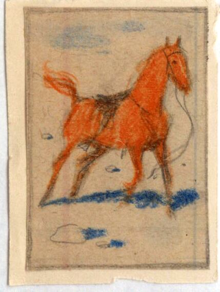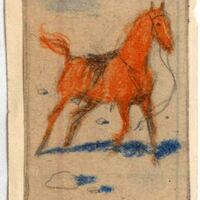 Sobre una superficie clara avanza al paso un caballo castaño claro sin su jinete. En el cielo hay unas nubes azules y sobre el suelo se refleja la sombra del caballo del mismo color que las nubes. El dibujo está enmarcado.Boceto realizado para la ilustración de la revista semanal Novelas y Cuentos. Titulo: La dama del Oeste. Autor: Pierre Benoit. Nº publicado: 1066. Fecha: 14-10-1951. Tomo NC. 59.