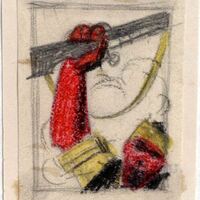 El tema de este dibujo enmarcado es la figura de un soldado del que se ve su cara y un brazo levantado empuñando una escopeta. Su piel es roja oscura y lleva una camiseta amarilla con un chaleco negro. Sobre su cabello oscuro lleva una cinta amarilla al estilo indio.Boceto realizado para la ilustración de la revista semanal Novelas y Cuentos. Titulo: Autor: Nº publicado: Fecha: Tomo NC.: