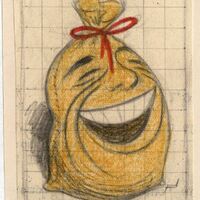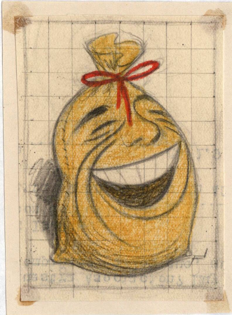 Sobre una superficie cuadriculada y enmarcada ha dibujado el pintor un gran saco amarillo con una boca muy sonriente, ojos y nariz. Un lazo rojo ata el saco. Hacia el lado izquierdo se puede apreciar el boceto de la firma del artista.Boceto realizado para la ilustración de la revista semanal Novelas y Cuentos. Titulo: El hombre que corrompió a una ciudad. Autor: Mark Twain.Nº publicado: 1138. Fecha: 01-03-1953. Tomo NC.: 44.