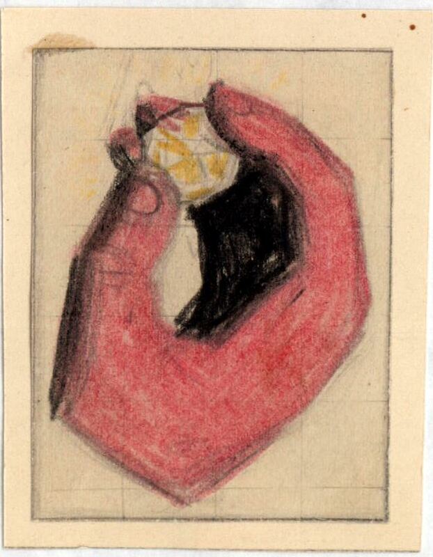 El escenario de este dibujo enmarcado está centrado en la imagen de una mano rosada que se encuentra cogiendo entre sus dedos una piedra pequeña y amarilla. El fondo del dibujo es ligeramente cuadriculado.Boceto realizado para la ilustración de la revista semanal Novelas y Cuentos. Titulo: El Gran Diamante. Autor: V. W. Tackeray. N º publicado: 909. Fecha: 10-10-1948. tomo NC.: 16