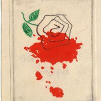 Sobre un fondo claro apreciamos una gran mancha de rojo con salpicados como si fuera de sangre y una rosa con su corona de pétalos formados por líneas concéntricas y onduladas de color negro y con el tallo y las hojas verdes. De nuevo, se encuentra el dibujo enmarcado.Boceto realizado para la ilustración de la revista semanal Novelas y Cuentos. Titulo: Los compañeros de Ulises. Autor: Pierre Benoit. Nº publicado: 1201. Fecha: 16-05-1954. Tomo NC.: 47
