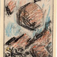 De un cielo azulado caen rocas rugosas de un gran tamaño depositándose en la tierra rocosa. No podemos, de momento, determinar exactamente lo que representa. El dibujo está enmarcado.Boceto realizado para la ilustración de la revista semanal Novelas y Cuentos. Titulo: Kowa la misteriosa. Autor: Charles Foley. Nº publicado: 807. Fecha: 27-10-1946. Tomo NC. 18