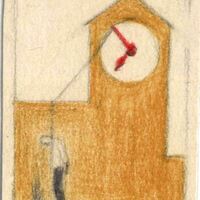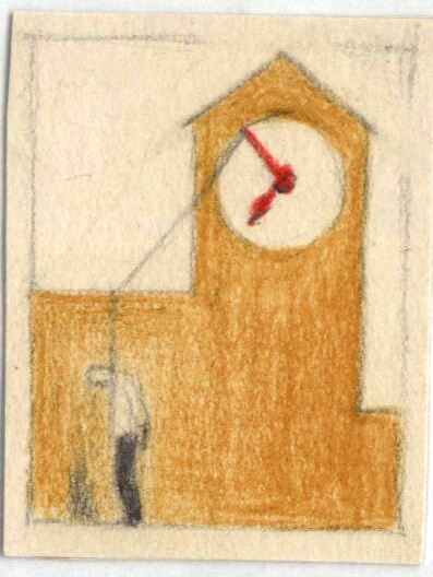 En esta escena llena de fantasía se ve la figura de un ahorcado con pantalón negro y camiseta blanca. La cuerda a la que está atado está sujeta a las manecillas rojas de un reloj que se sitúa en la fachada de una torre en un edificio amarillento.Boceto realizado para la ilustración de la revista semanal Novelas y Cuentos. Titulo: La Casa Misteriosa. Autor: Brence Hamilton. Nº publicado: 1263. Fecha: 24-07-1955. Tomo NC. 43.