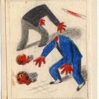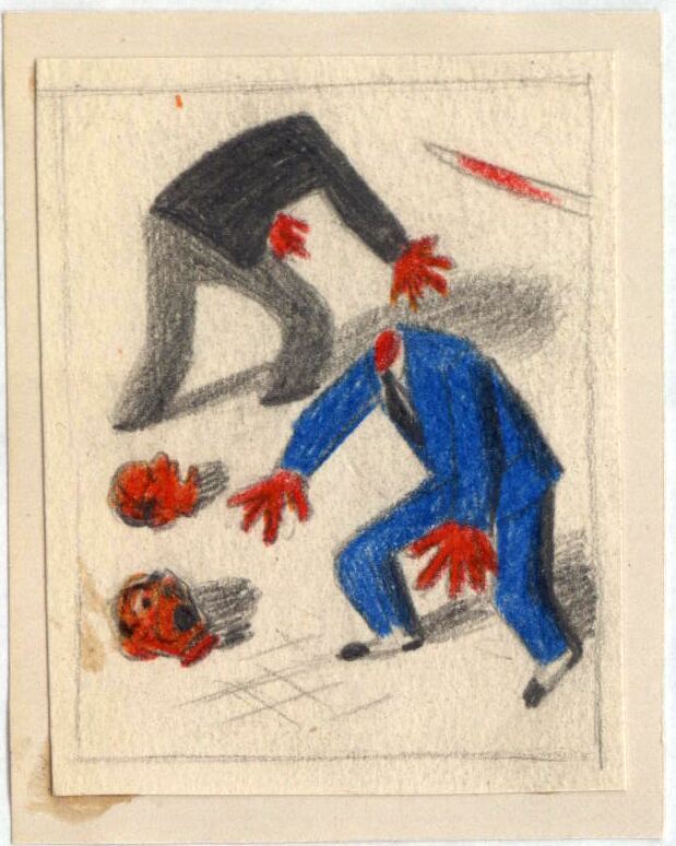 Dos hombres con las manos rojas y grandes, uno de traje negro y otro de traje azul, buscan por el suelo sus cabezas rojas cortadas. En la parte superior de la izquierda sobresale el filo ensangrentado de una espada. El dibujo está enmarcado.Boceto realizado para la ilustración de la revista semanal Novelas y Cuentos. Titulo: La Dama de la Pluma Negra. Autor: Julio Noriac. Nº publicado: 1203. Fecha: 30-05-1954. Tomo NC. 40