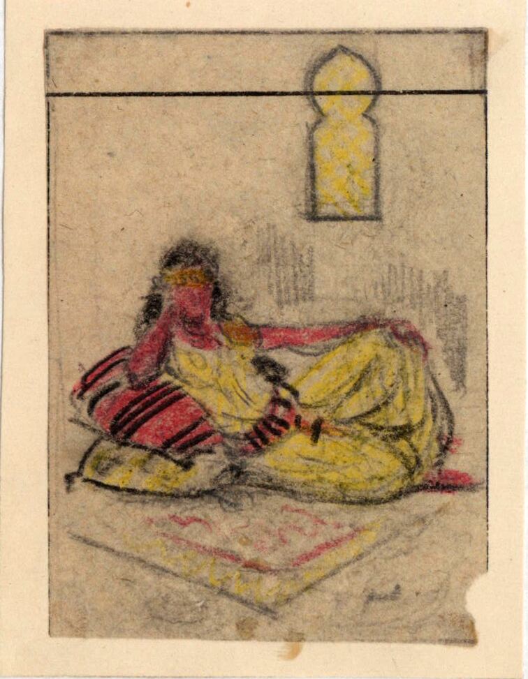 En el escenario de las mil y una noches, sobre unos almohadones amarillos y a rayas negras y rojas, descansa una muchacha del harén de un sultán árabe. Sus cabellos sueltos son negros como la noche y su traje es amarillo. Destaca en la composición un ventanal de características árabes cuyo fondo es amarillo. En la parte superior del dibujo enmarcado destaca una línea oscura en posición horizontal. Se puede apreciar, también, la firma del pintor.Boceto realizado para la ilustración de la revista semanal Novelas y Cuentos. Titulo: Autor: Nº publicado: Fecha: Tomo NC.