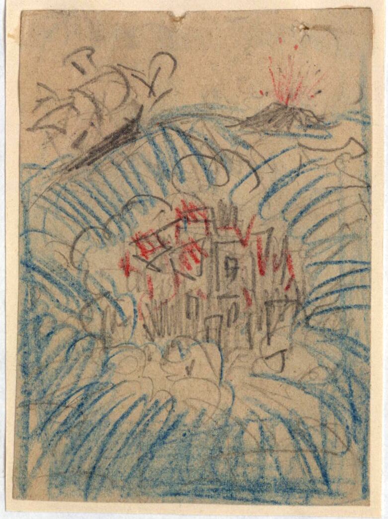 - De las aguas azules del mar, que se abren, dejan en su centro un pequeña cavidad donde crece una aldea y a su alrededor una barco navega. A lo lejos un volcán entra en erupción.Boceto realizado para la ilusgracion de la revista semanal Novelas y Cuentos. Titulo: Autor: Nº publicado: Fecha: Tomo NC.