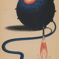 En el centro de esta composición firmada destaca la imagen de una bomba de color azul a la se ha encendido una llama en su extremo, una cuerda con forma ondulante. Sobre la bomba destaca una mancha roja.Prueba de imprenta. Ilustración realizada para la revista semanal de Novelas y Cuentos. Titulo: Rouletabille en Rusia. Autor: Gaston Leroux. Nº publicado: 924. Fecha: 23-01-1949. Tomo NC. 10.