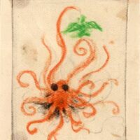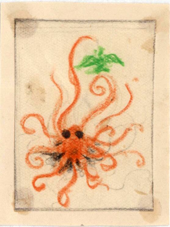 - En este dibujo enmarcado se muestran las figuras de un pulpo naranja de largos tentáculos y grandes ojos negros y de un pájaro verde que revolotea por encima del pulpo.