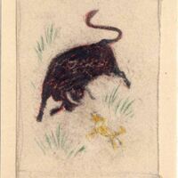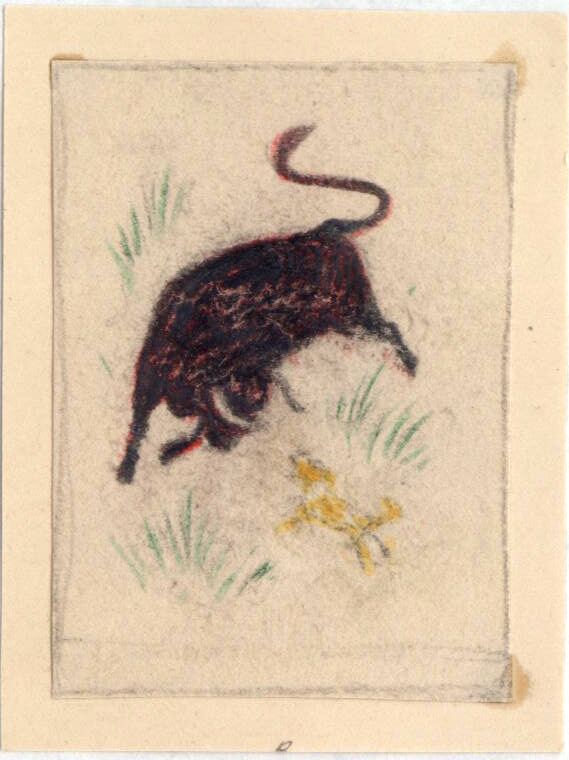 - Se encuentra en un paisaje, la simpática imagen de un toro negro frente a un diminuto perro, realizado a base de a manchas amarillas y blancas. Algunos golpes de lápiz verde representan el césped del campo. El dibujo está enmarcado.Boceto realizado para la ilustración de la revista semanal Novelas y Cuentos. Titulo: Autor: Nº publicado: Fecha: Tomo NC. PI/. No