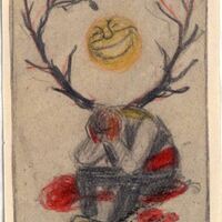 Sobre el cielo brilla un sol al que se le ha pintado con cara humana riendo. Frente a un árbol de dos enormes ramas un hombre sentado con pantalón y chaleco negro, camisa blanca y fajín rojo llora desconsoladamente escondiendo su cara entre las manos. El dibujo está enmarcado.Boceto realizado para la ilustración de la revista semanal Novelas y Cuentos. Titulo: El curandero de su honra. Autor: Ramòn Pérez de Ayala. Nº publicado: 1029. Fecha: 28-01-31. Tomo NC. 58