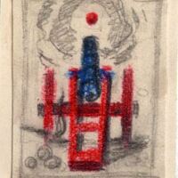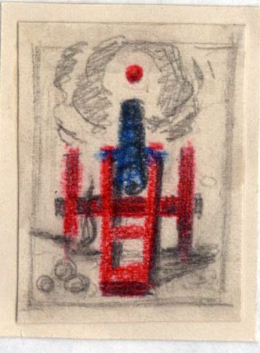 Apoyado en su base de madera roja un cañón azul dispara hacia el horizonte. A su lado una mecha de fuego en blanco y negro lo enciende. A lo lejos, envuelta en humareda, se vislumbra el disparo en forma de bola de acero rojo. El dibujo se encuentra enmarcado.Boceto realizado para la ilustración de la revista semanal Novelas y Cuentos. Titulo: El Bloqueo. Autor: Erckmann Chatrian. Nº publicado: 1296. Fecha: 11-03-1956. Tomo NC. 51