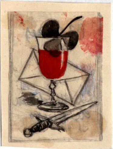 Cuatro elementos se hallan en la escena de este dibujo enmarcado: una copa de cristal llena de vino hasta la mitad, un puñal y, por detrás de la copa, un sobre sellado. Encima de la copa un trébol de tres hojas.Boceto realizado para la ilustración de la revista semanal Novelas y Cuentos. Titulo: La maldición de Siva. Autor: W. Chesney. Nº publicado: 836. Fecha: 08-05-1947. Tomo NC 11.
