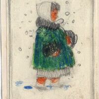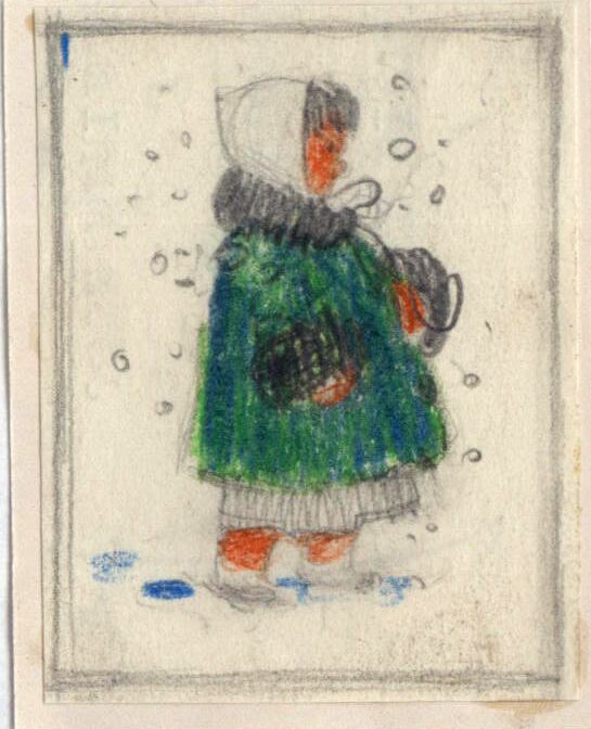 En un paisaje de invierno frío donde todo está sepultado por la nieve destaca la figura de un niño pequeño de perfil. Muy abrigado, lleva un abrigo verde por encima de un vestido blanco y un gorro también blanco. El dibujo se halla enmarcado.Boceto realizado para la ilustración de la revista semanal Novelas y Cuentos. Titulo: Silas Marner. Autor: George Eliott. Nº publicado: 1290. Fecha: 29-01-1956 Tomo NC. 32.