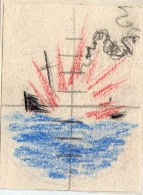 Sobre un fondo claro se disponen dos líneas negras, una en vertical y otra en horizontal, formando una cruz. Alrededor se disponen sin seguir un orden ni formando figuras precisas colores azules, rojos y negros. En primer término aparece el visor de un periscopio y al fondo la explosión de un barco como se le hubiesen disparado un torpedo.Boceto realizado para la ilustración de la revista semanal Novelas y Cuentos. Titulo: Autor: Nº publicado: Fecha: Tomo NC.