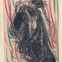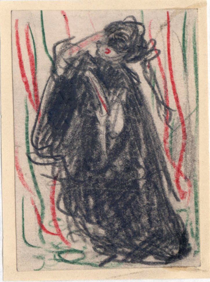 - Sobre un fondo creado a base de líneas rojas y verdes, que parecen hilos de tela propia de un teatro, donde destaca la gran mancha informe de color negro, que es el vestido de un vestido-disfraz de una actriz. El dibujo está enmarcado.Boceto realizado para la ilustración de la revista semanal de Novelas y Cuentos. Titulo: Autor: Nº publicado: Fecha: Tomo NC.